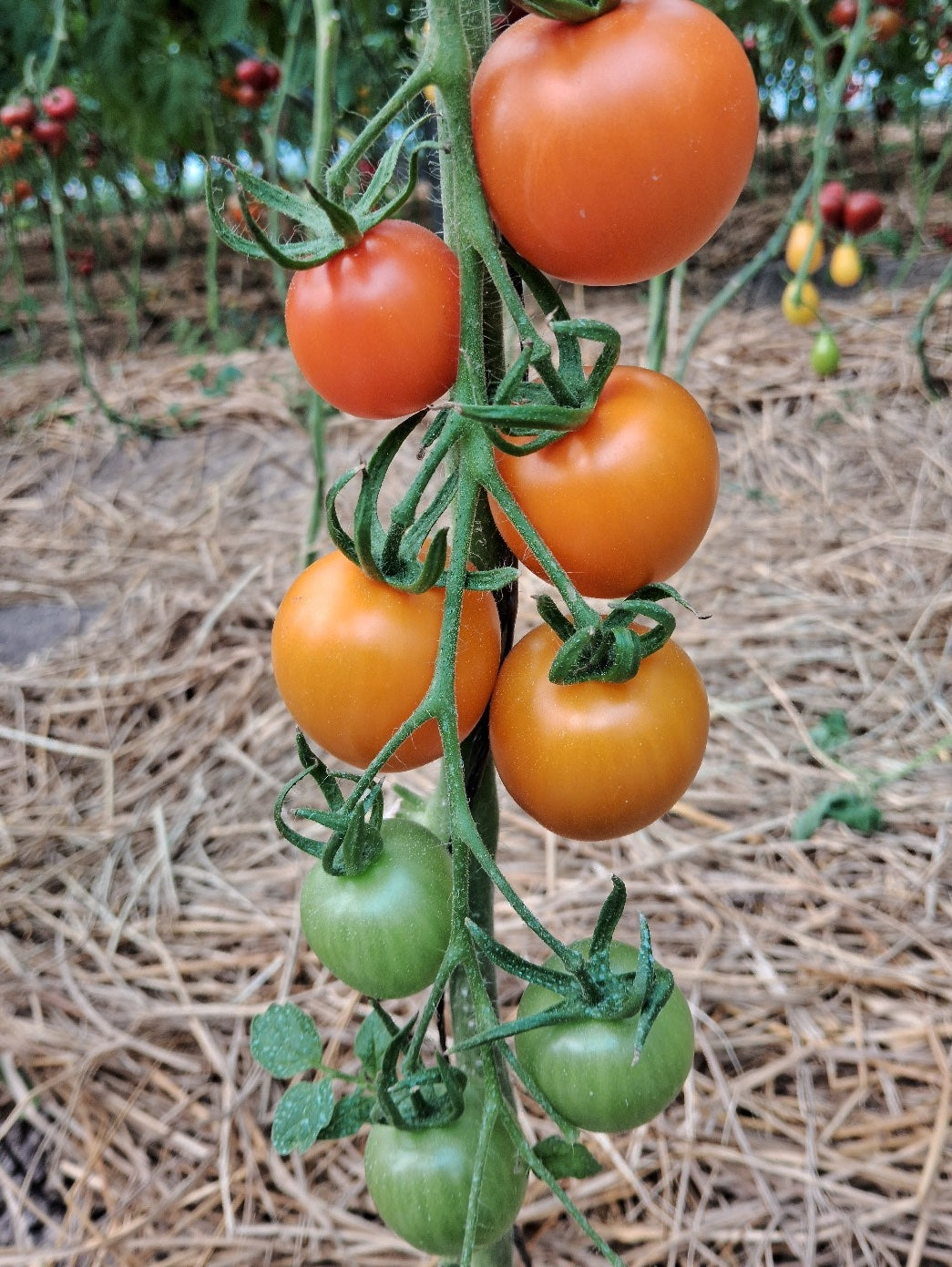 A prolific variety that produces clusters of small, round tomatoes with a vibrant red color...