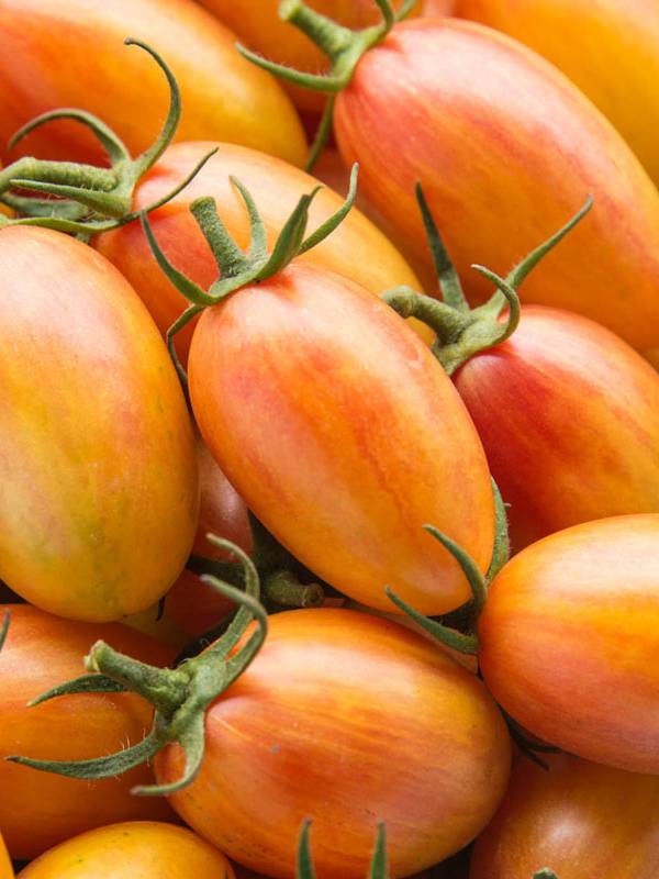 มะเขือเทศเชอร์รี่สีส้มอมชมพู รูปทรงยาวรี มีลายเส้นสีเขียวเข้ม รสชาติหวานอมเปรี้ยว ออกผลดก